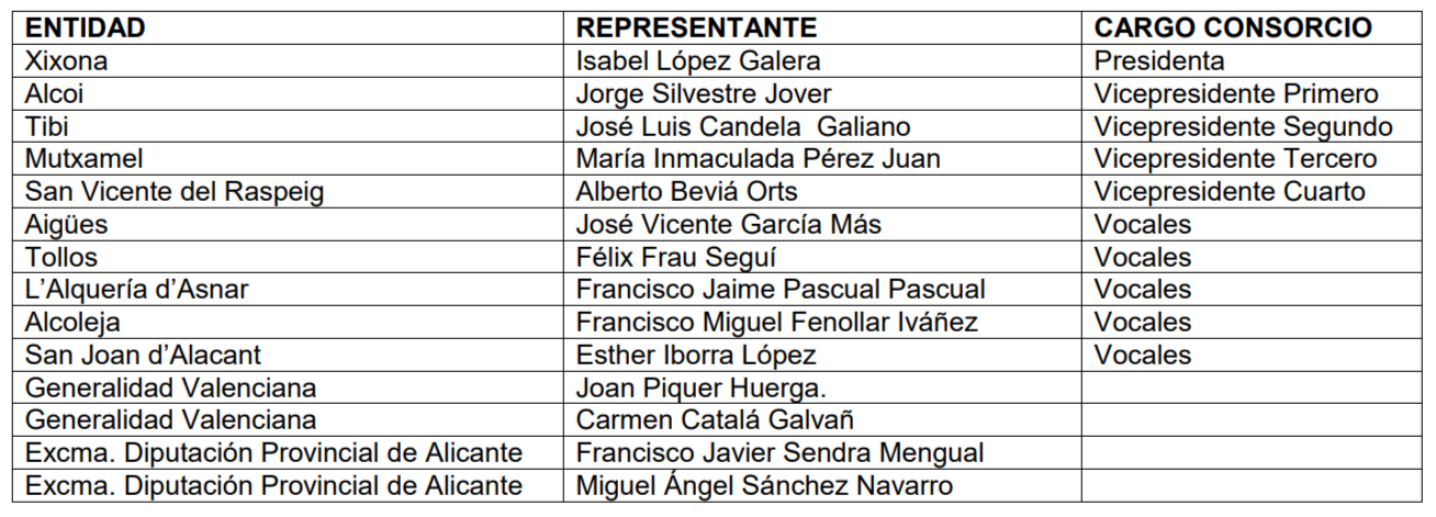 La Comisión de Gobierno la conforman la Presidencia, 4 vicepresidentes, 5 vocales, que corresponden a ayuntamientos, 2 representantes de la Generalitat Valenciana y 2 de la Diputación de Alicante. Son elegidos cada cuatro años.